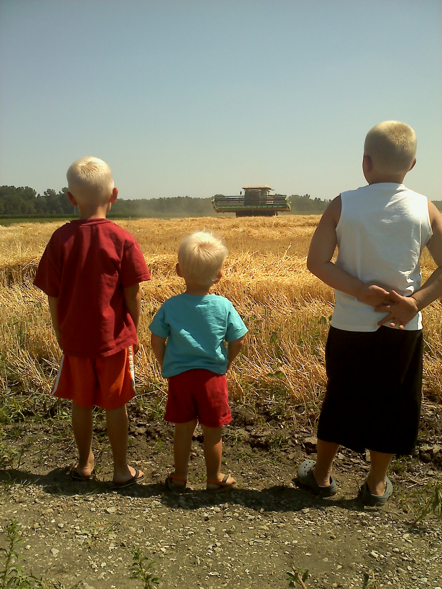 The Westhues Boys of Glasgow, Missouri watch as their Grandfather combines the wheat in June of 2012. The farm is a family owned farm which will have the three boys in front being the fourth generation farmers. Each of the boys love to combine with Grandpa and Dad and help with the unloading of the grain. After wheat harvest, they all helped their uncle bale and load the straw from the same farm.